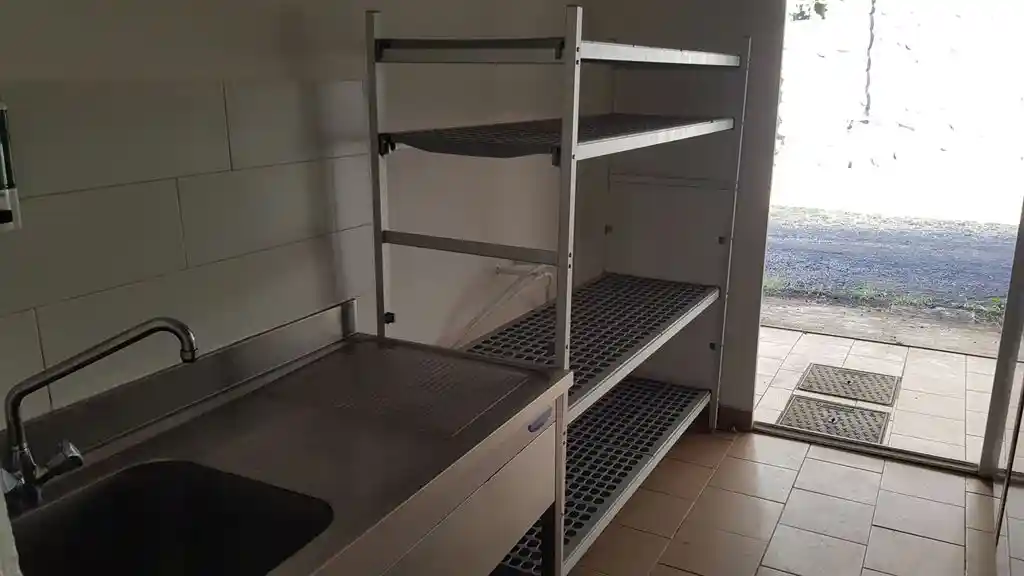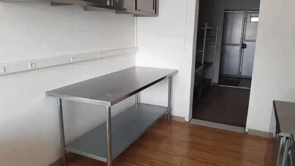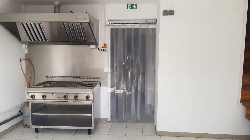 Un espace dédié à la production chaude est également présent, équipé d’un piano professionnel en 380 volts avec hotte, ainsi que d’un évier inox. Un second atelier, adaptable à une activité de traiteur, boulangerie ou pâtisserie, complète l’ensemble avec une table réfrigérée, des étagères inox et une climatisation neuve.