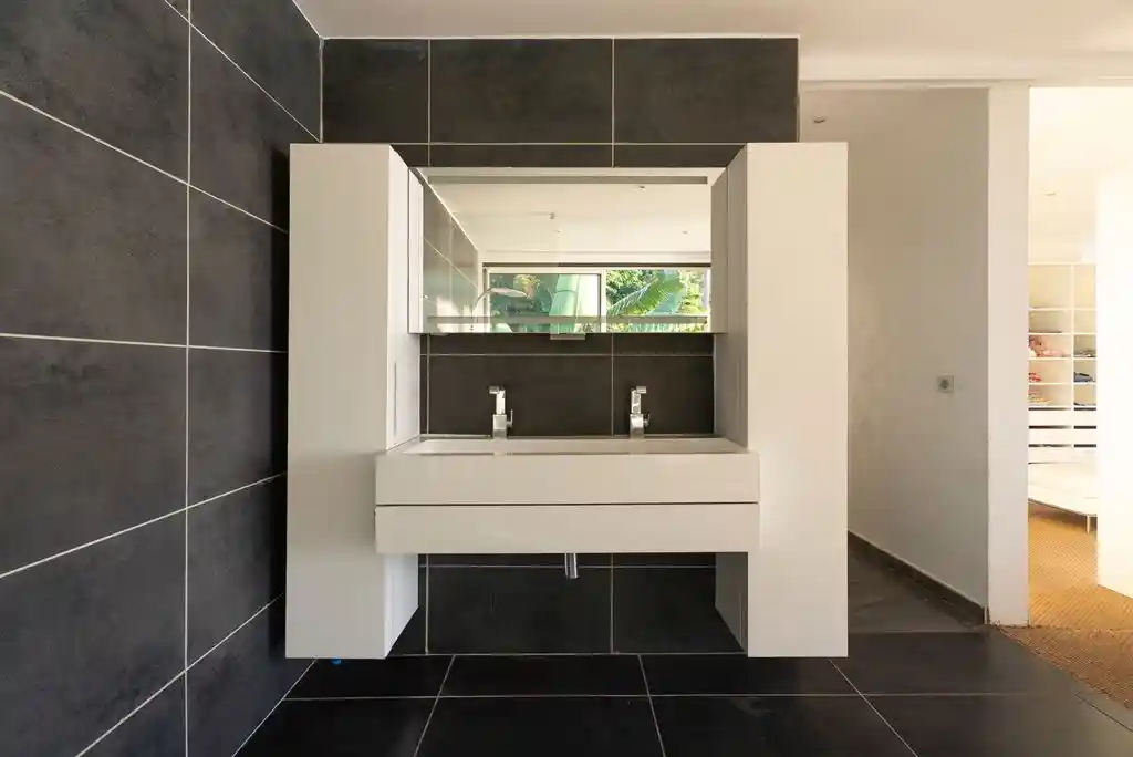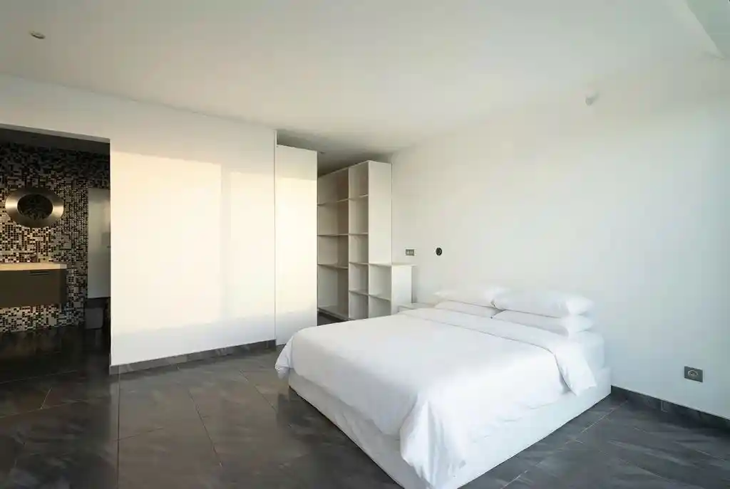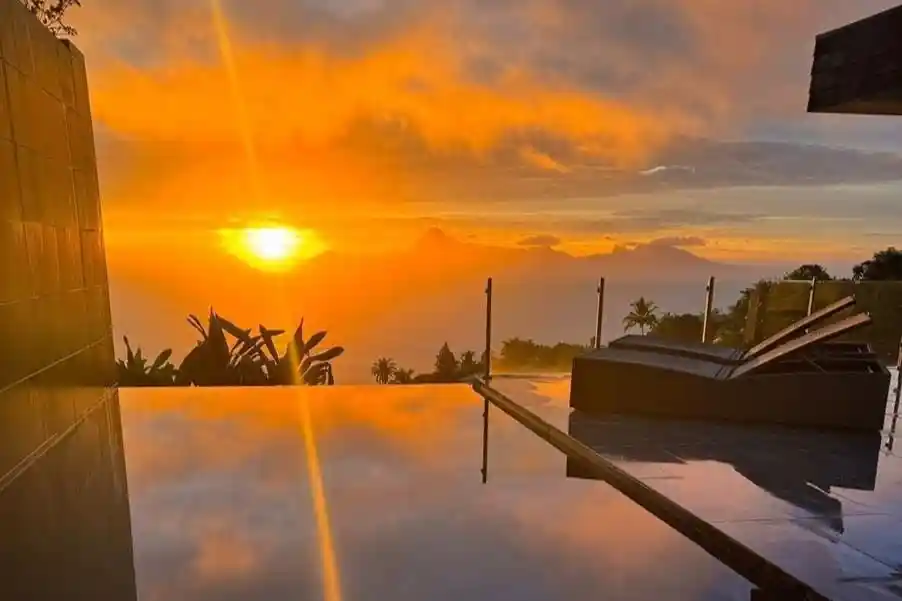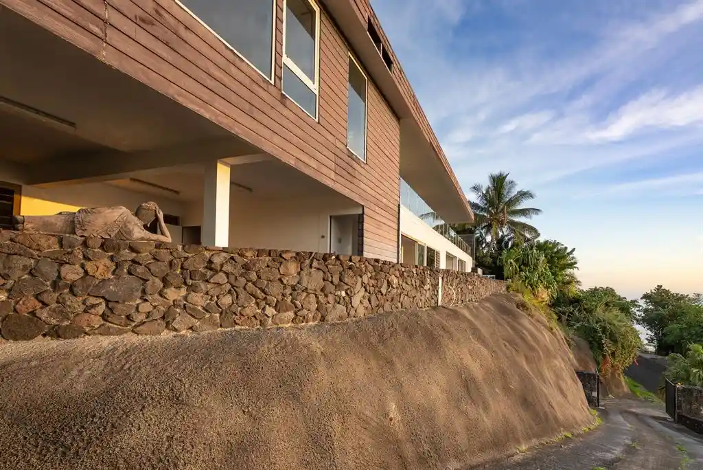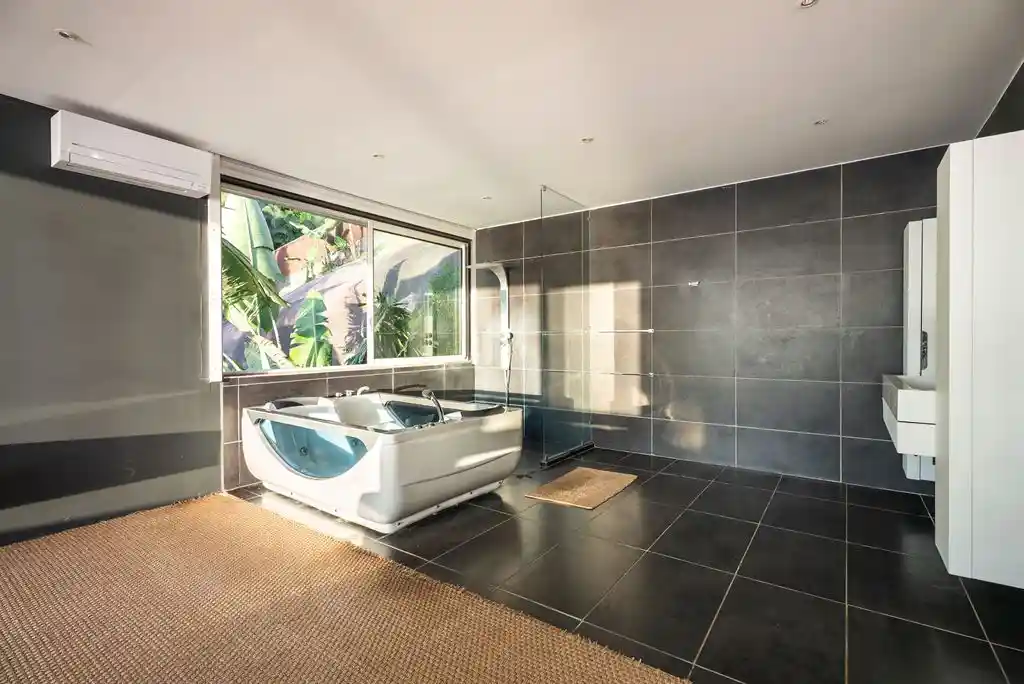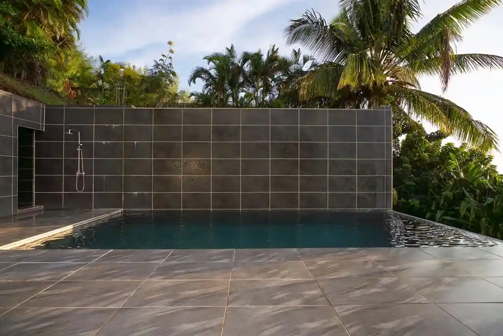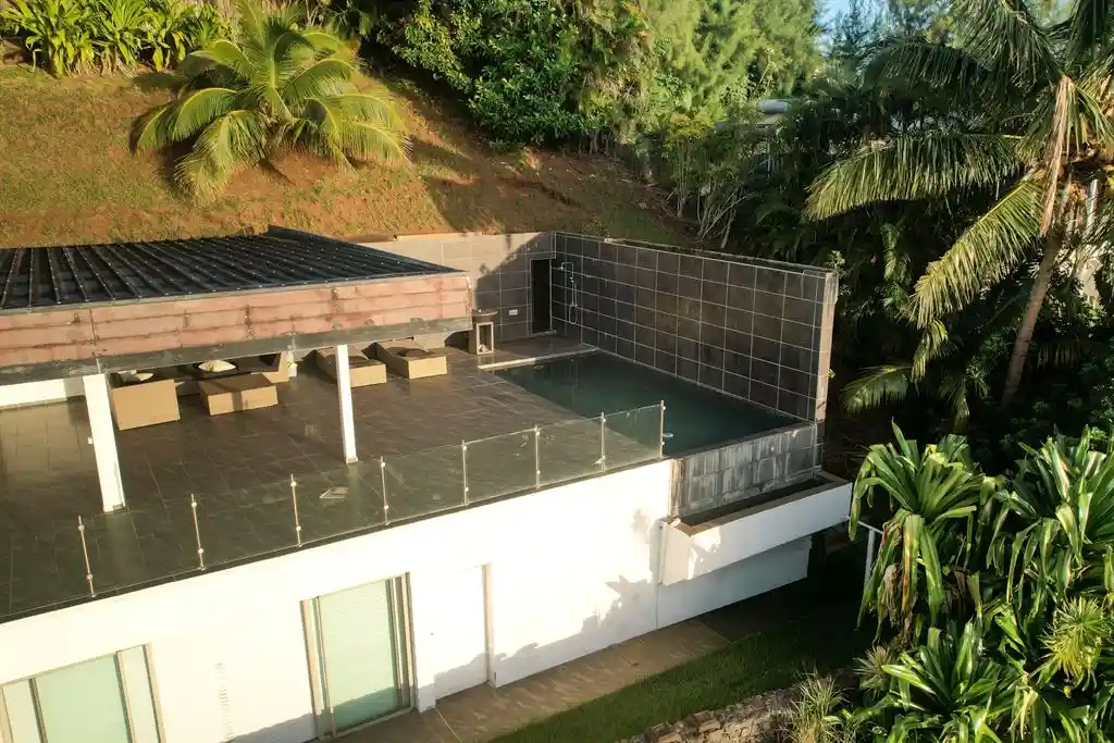 La terrasse s’ouvre sur une piscine agrémentée d’un jet en cascade, ajoutant une dimension esthétique et sonore à l’espace extérieur. L’ensemble bénéficie d’une vue dominante, visible depuis les pièces de vie comme depuis l’espace piscine.