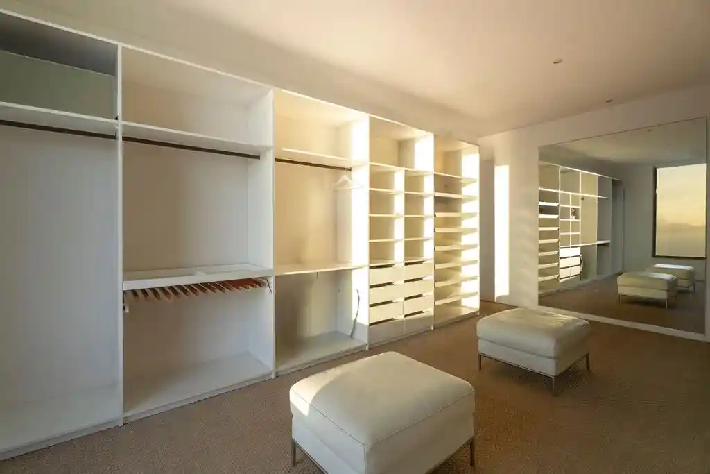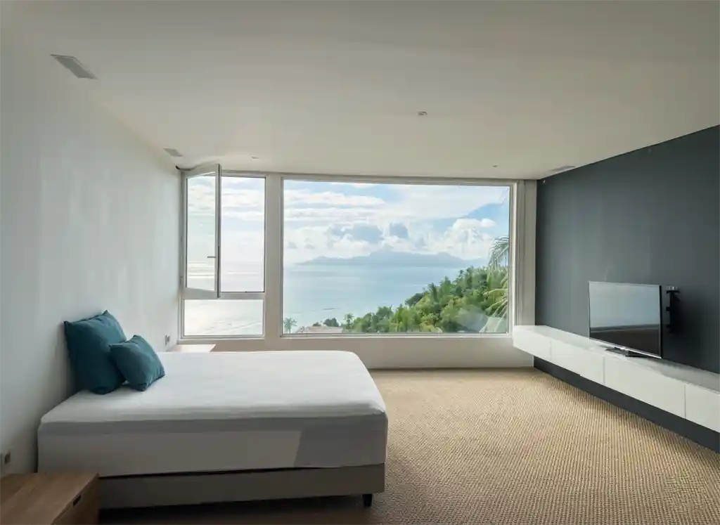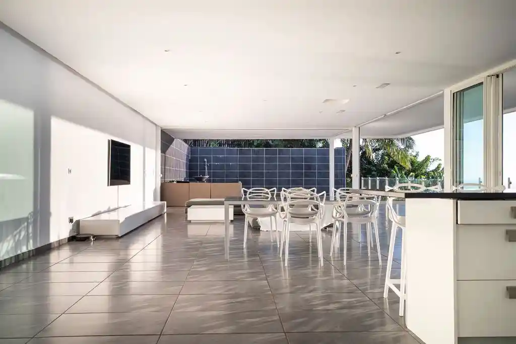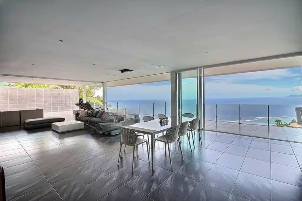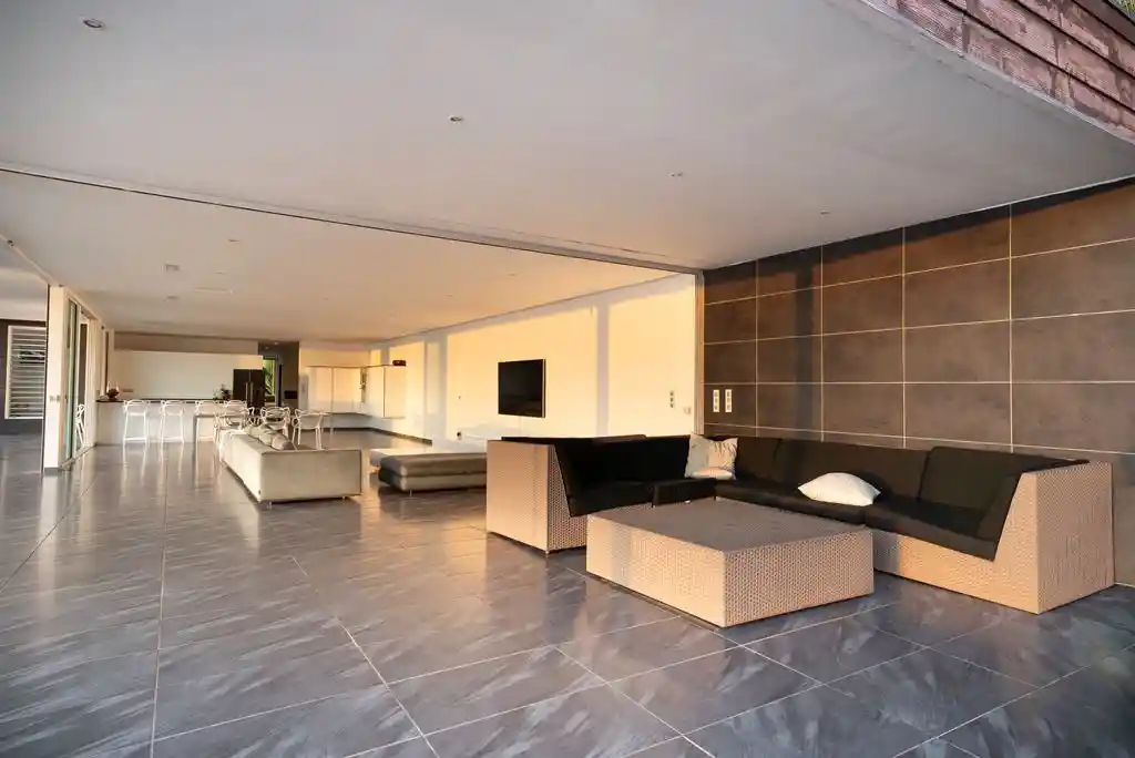 Ce séjour est mis en valeur par de larges baies vitrées coulissantes permettant une ouverture presque totale sur l’extérieur. Cette configuration crée une continuité naturelle entre l’intérieur et la terrasse, tout en apportant une belle luminosité et une vue dégagée particulièrement agréable.