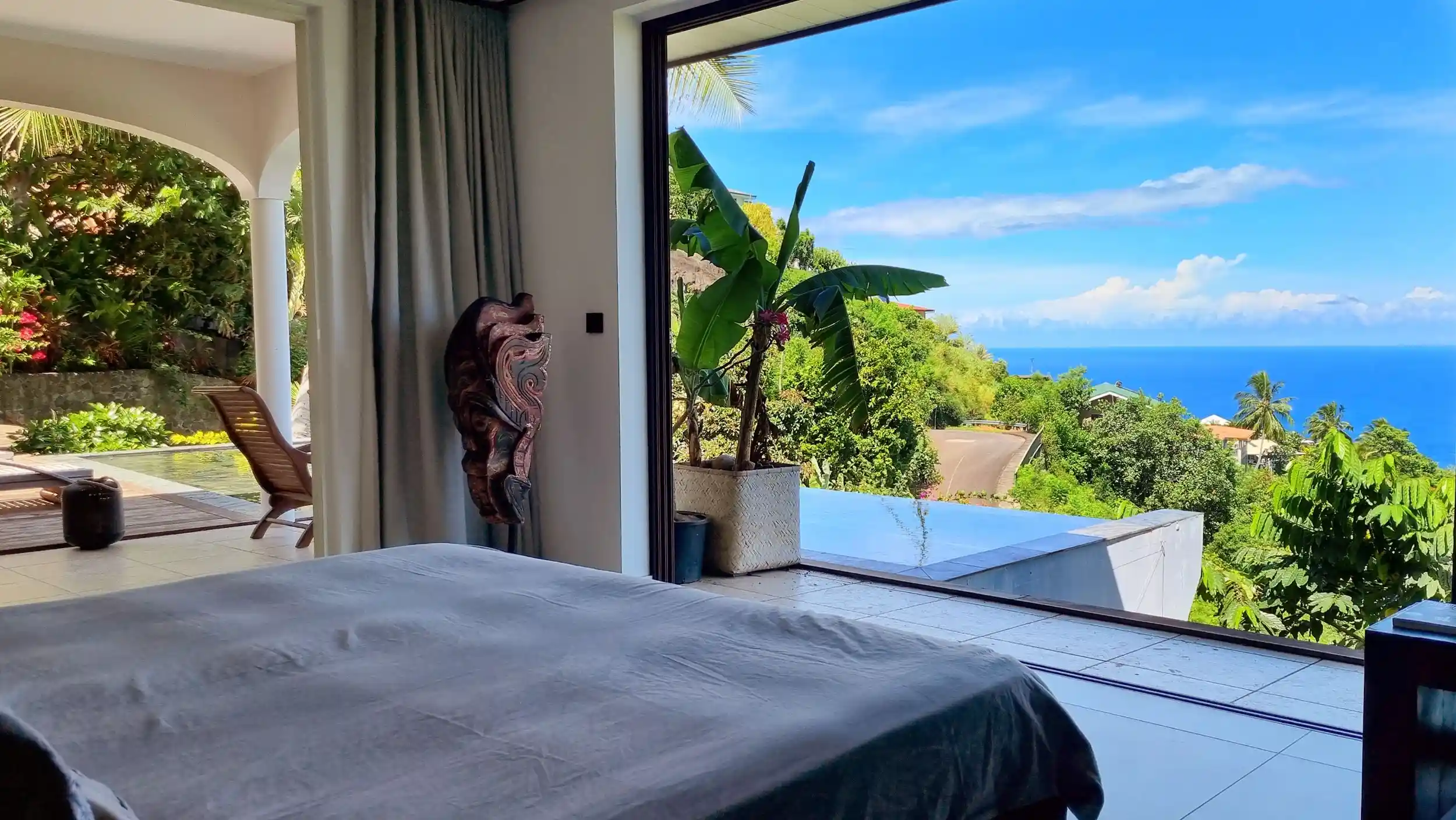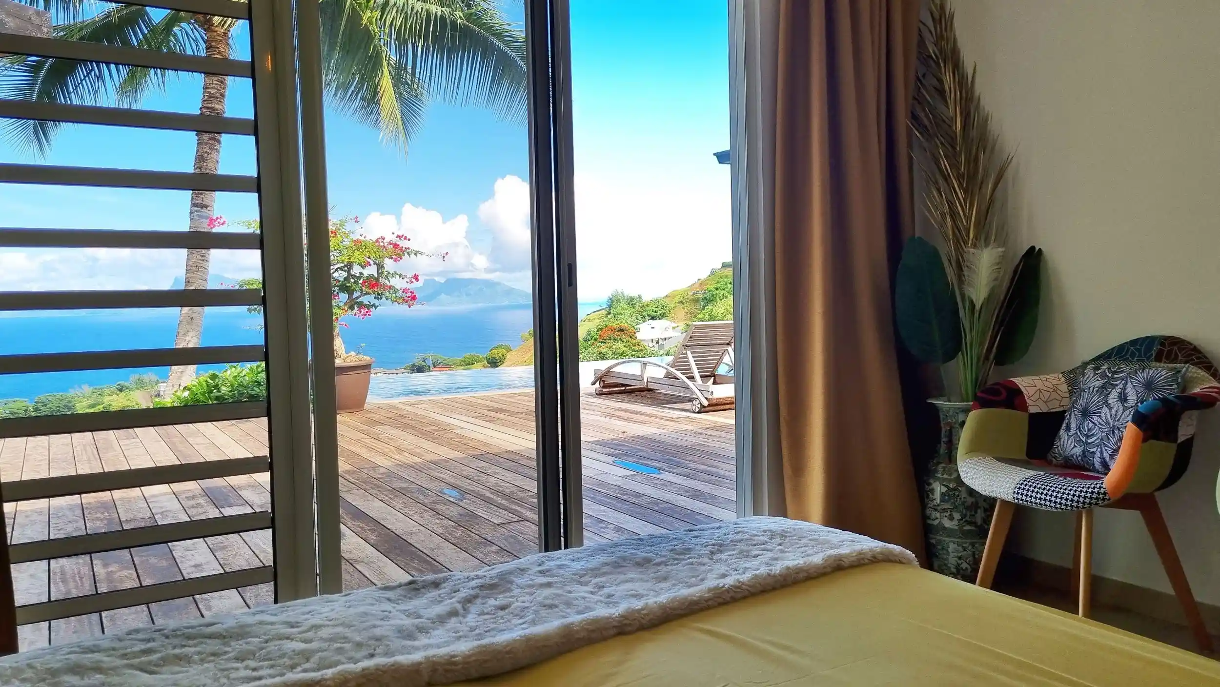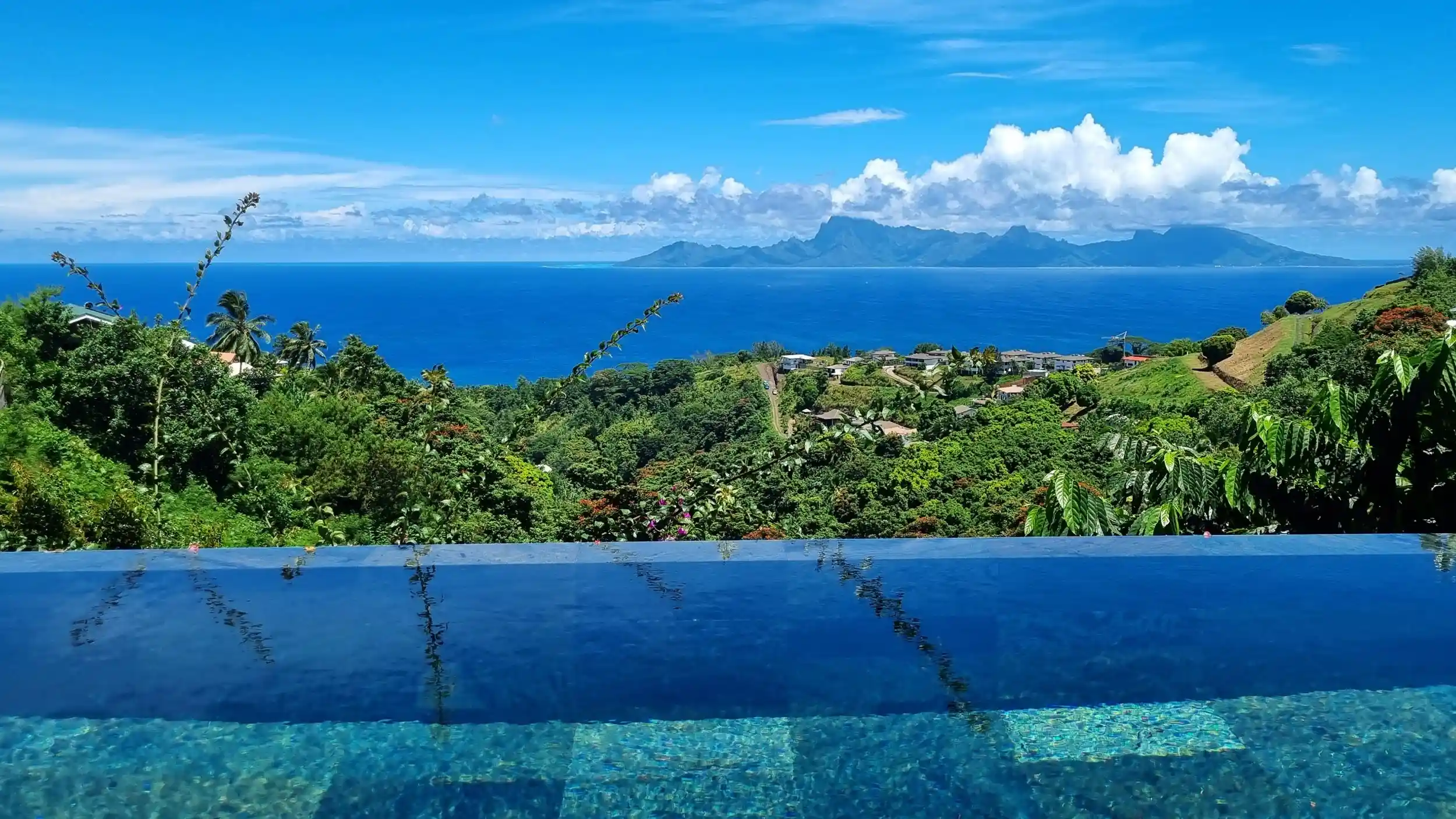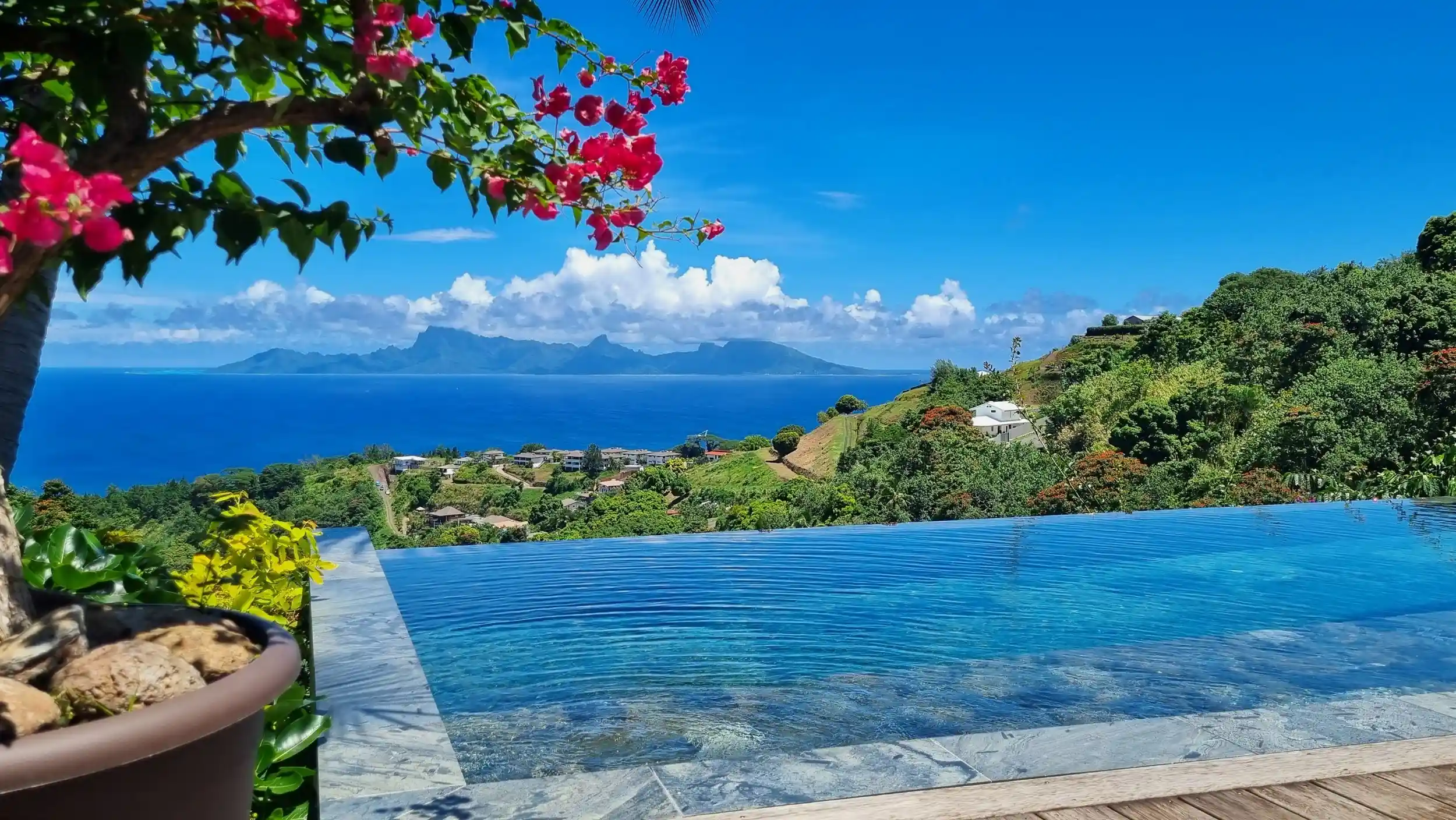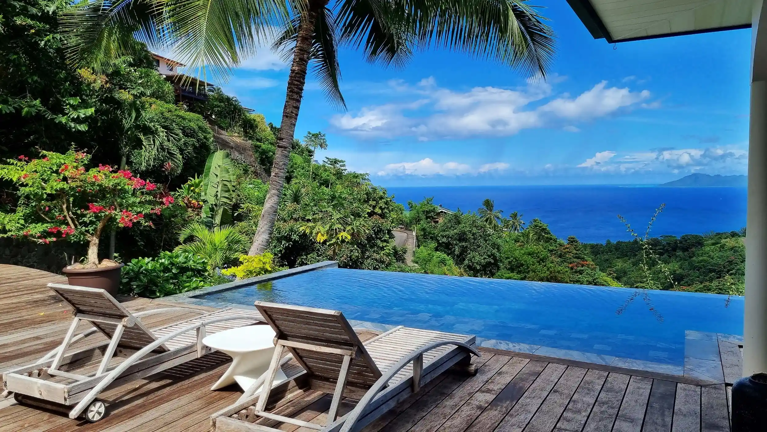 À l’extérieur, la terrasse prolonge naturellement les espaces de vie jusqu’à une piscine à débordement, tournée vers Moorea.