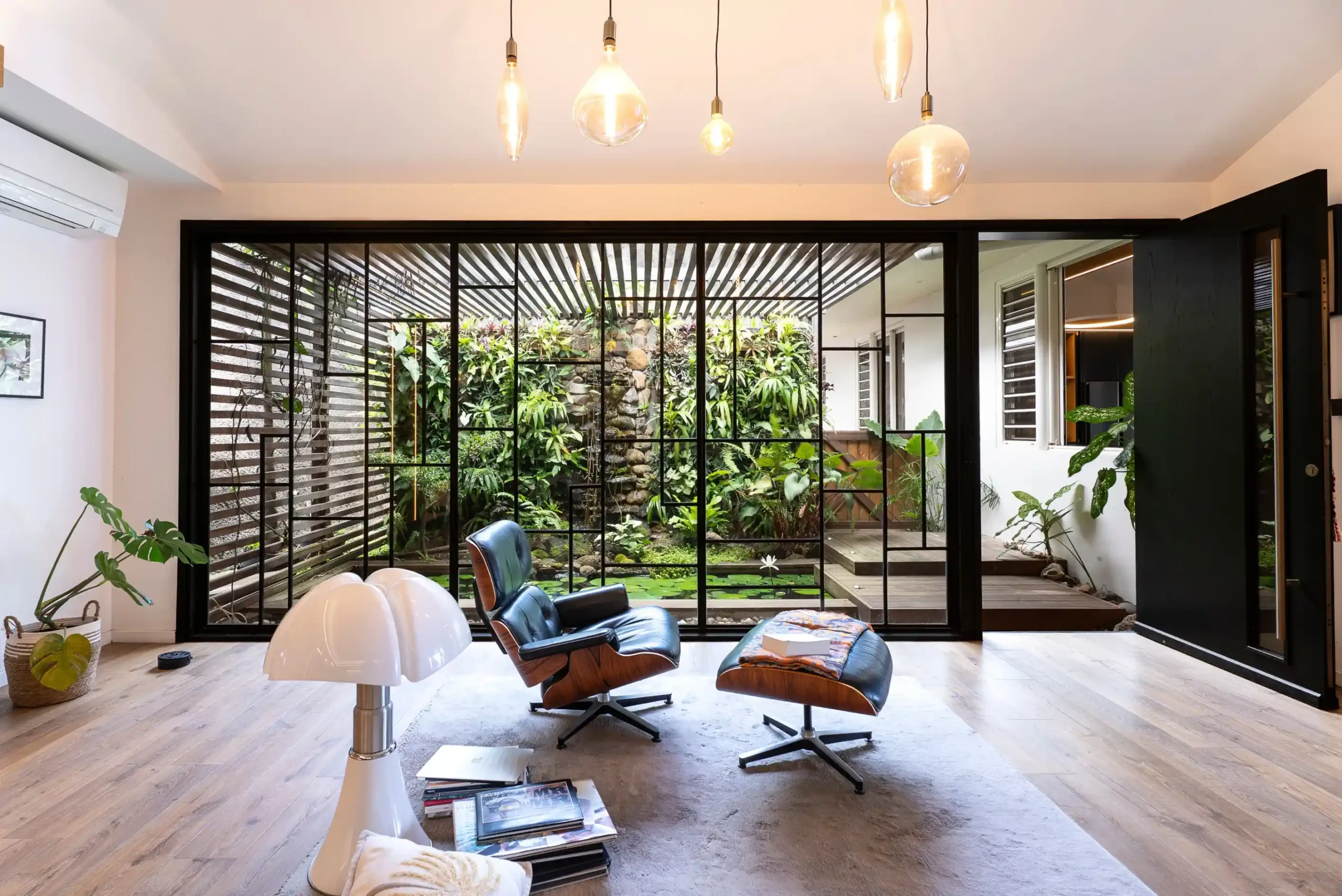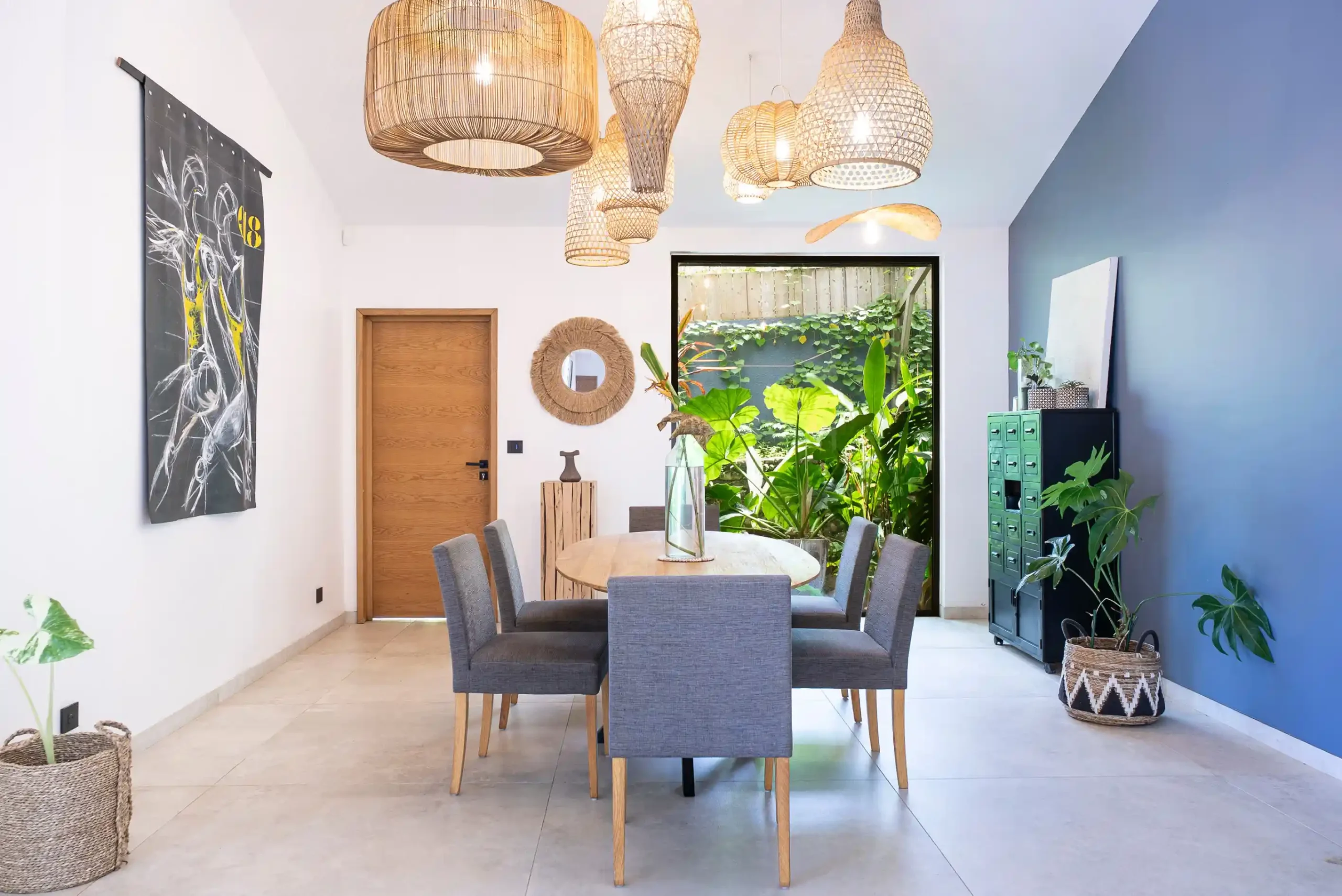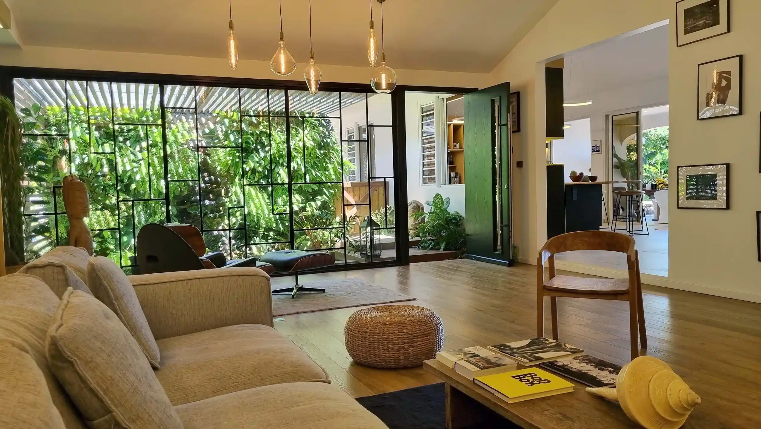 La villa, d’environ 200 m², propose de beaux volumes avec un vaste séjour ouvert sur la cuisine et une bibliothèque, le tout prolongé par une vue apaisante sur un jardin intimiste agrémenté d’un bassin japonais.