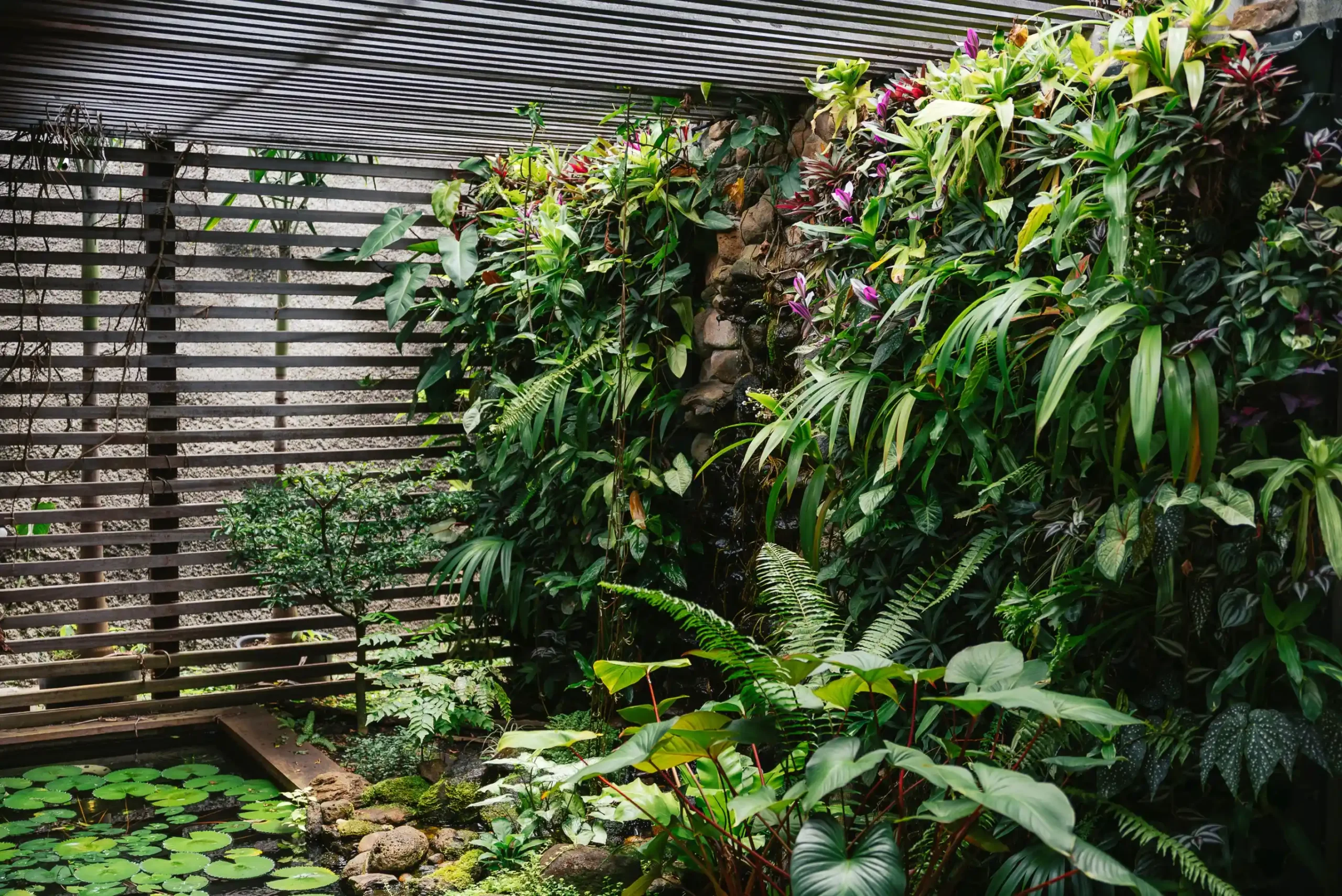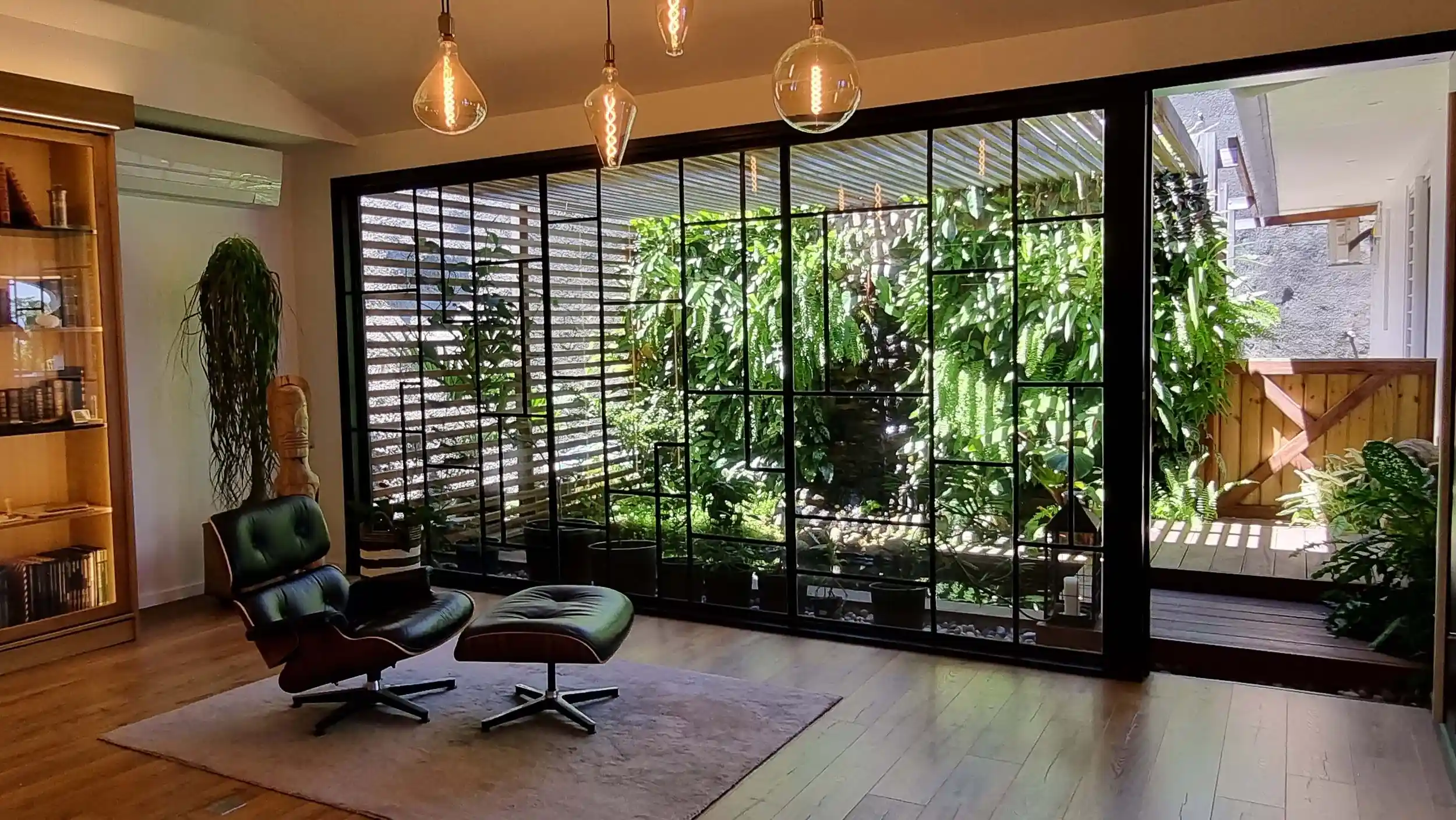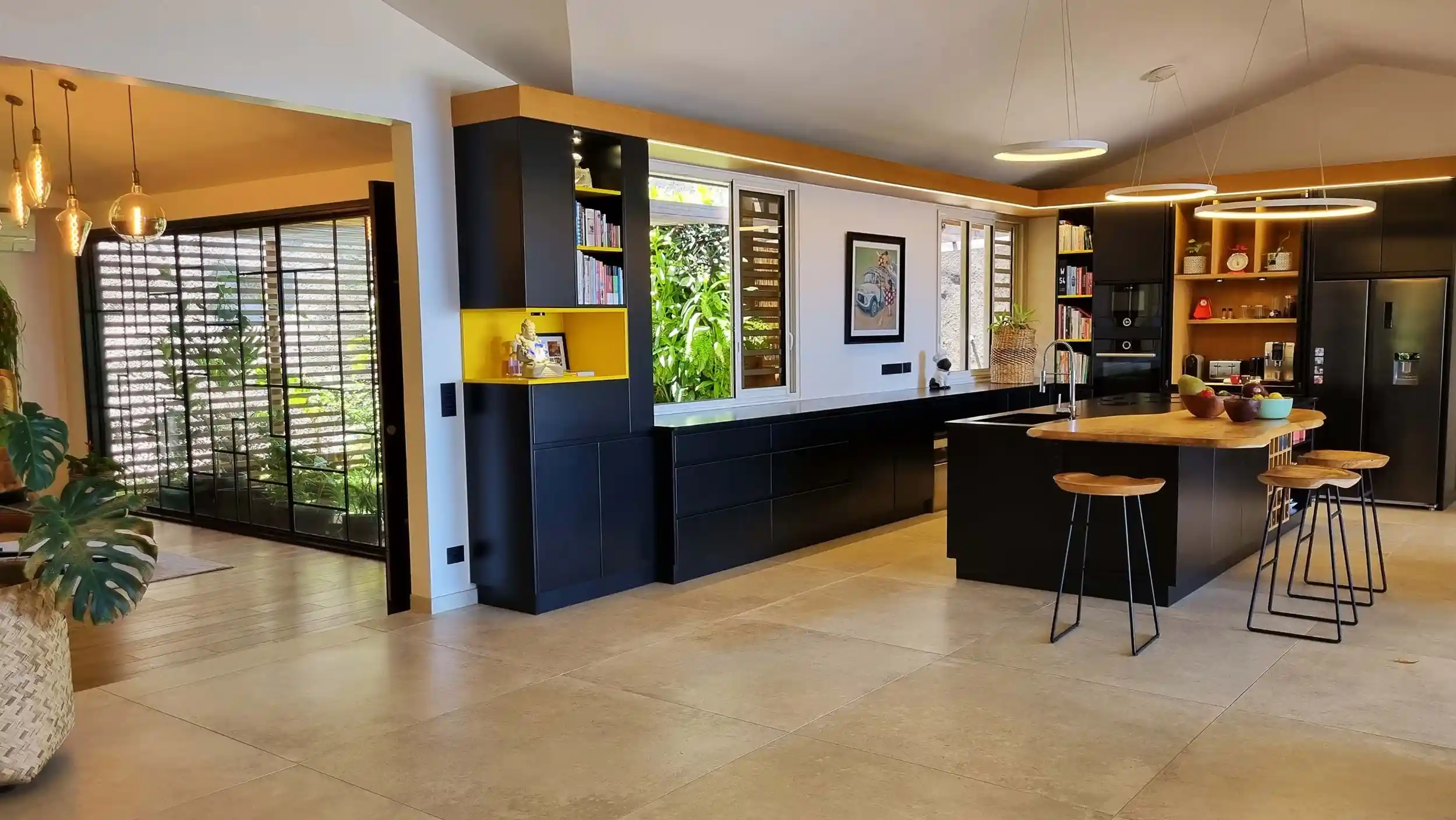 La villa, d’environ 200 m², propose de beaux volumes avec un vaste séjour ouvert sur la cuisine et une bibliothèque, le tout prolongé par une vue apaisante sur un jardin intimiste agrémenté d’un bassin japonais.
